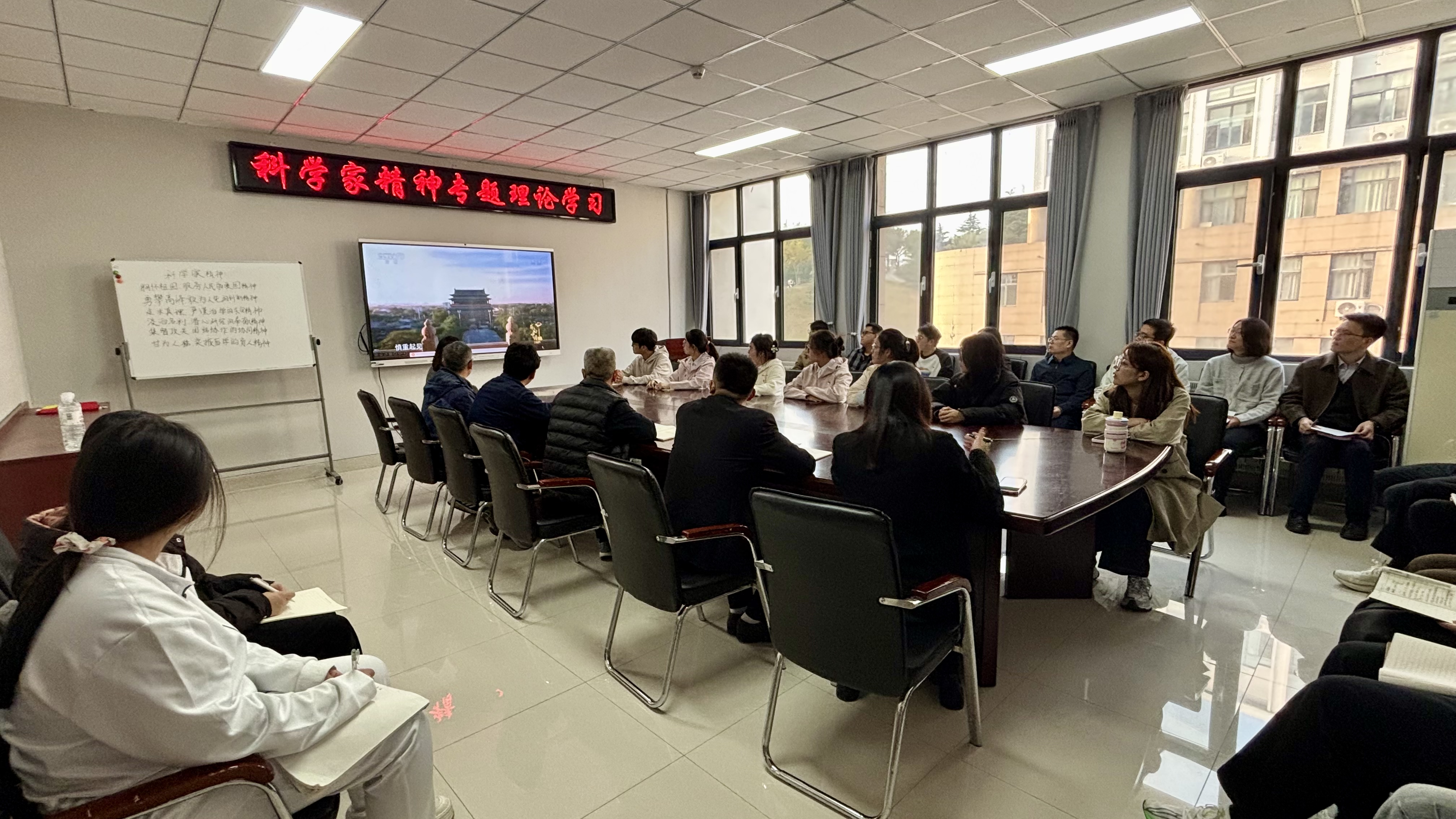 会上,与会人员集体观看了物理学家杨振宁先生的专题视频。学生党员代表进行了科学家精神专题领学,系统阐释了其爱国、创新、求实、奉献、协同、育人的核心内涵。在交流分享环节,教工党员代表吕浩、张瑞坤、程尊水结合自身科研教学经历,分享了在教书育人和探索真理中践行科学家精神的体会。学生党员与本科新生代表则畅谈学习感悟,表达了以科学家为榜样、刻苦学习、报效祖国的决心。