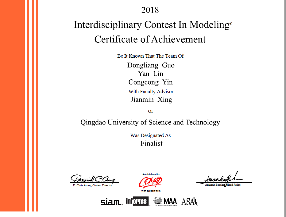 组织我校学生参加的2018年美国大学生数学建模竞赛成绩揭晓。参赛队伍共30支,获得国际特等提名奖(Finalist Winner)1项,国际一等奖(Meritorious Winner)11项,国际二等奖(Honorable Mention)12项,成功参赛奖(Successful Participant) 6项,获奖率为80%(其中国际一等奖及以上的获奖率为40%,远高于9%的美赛一等奖平均获奖率),获奖数量和质量均创我校历史最好成绩,获奖率位列山东省第一。尤其值得一提的是,邢建民老师指导的由信息学院郭栋梁,经管学院林燕,和高分子学院尹聪聪组成的参赛队,斩获国际特等提名奖(全球20602支参赛队中,国际特等奖提名奖只有45项),这是我校美赛史上首次获此殊荣,在国际舞台上展现了青科大学子勇于拼搏和敢于创新的精神风貌,为学校赢得了荣誉。