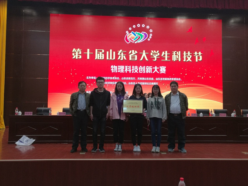 共有4组作品参加本次大赛并取得了优异成绩,获一等奖2项、二等奖2项。其中于燚、索嘉成、马云飞等同学的作品《定量研究非磁性旋转导体盘阻尼效应的实验演示装置》和崔玉倩、孟家锋、崔春祥等同学的作品《水槽式洛伦兹力演示实验装置》获得山东省一等奖;徐召来、傅雅君、李雨竹等同学的作品《空气磁导率的测定》和张志远、苗一凡、徐建一等同学的作品《新型导热系数教学实验测量仪器演示仪》获得山东省二等奖。杨清雷老师获得“优秀指导教师”称号,我校获得“优秀组织奖”。