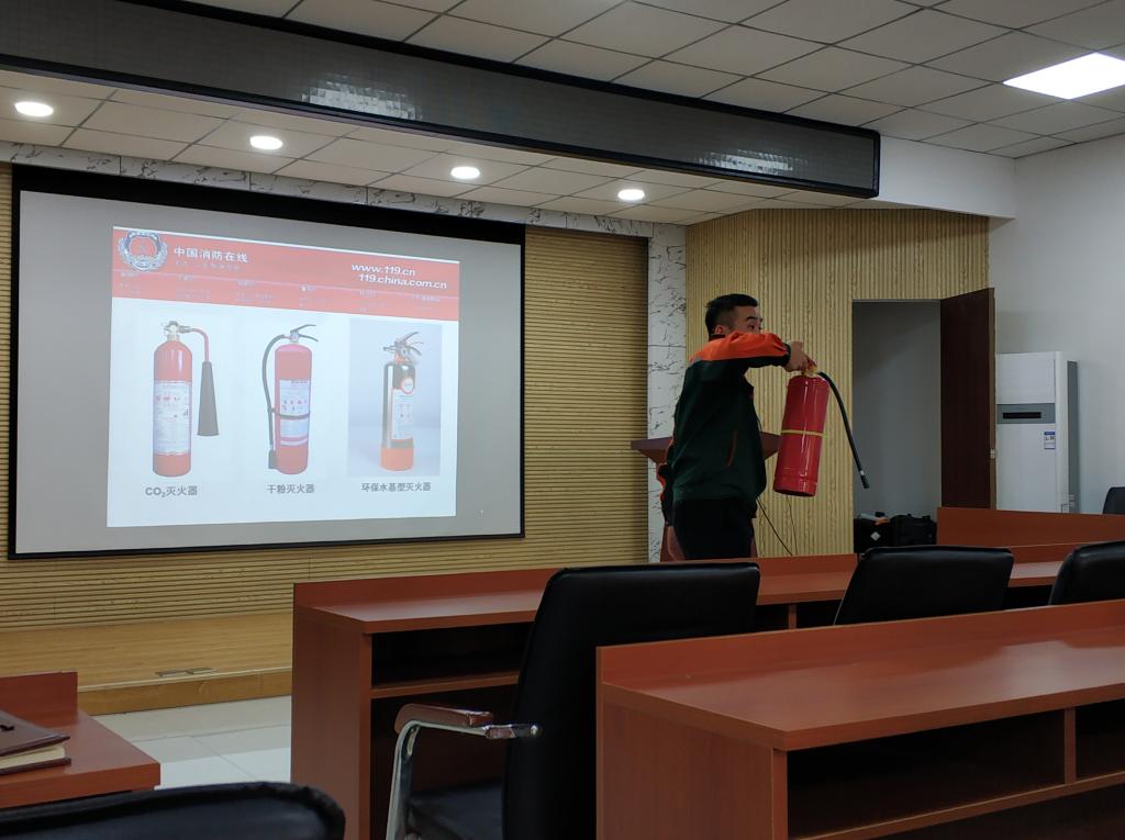 史主任结合实际案例、多媒体课件阐述了火灾的预防和发生时如何自救与互救,燃气泄漏、高楼遇火如何逃生,电线老化及电器火灾隐患等情况如何处置,并对教师进行消防知识普及,讲解灭火器使用方法及注意事项。