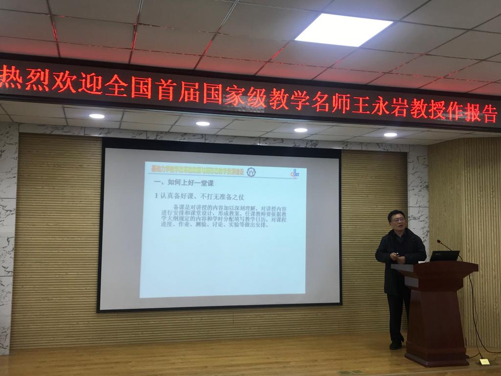 一是如何上好一堂课。王教授提出,教师应当认真备课,合理组织教学内容,写出教案,不断收集整理最新成果与典型案例,不断充实教学内容,处理好本课程与先修课、后续课之间的衔接。他强调,教师要训练并注重“粉笔加黑板”授课能力,这是教师的基础技能。二是如何命题考试与试卷评价。他提出,难度、区分度、信度和效度四大指标是评价考题考卷的标准,教师在每次考试命题时都应该考虑题型功能与试题的“四度”分析指标,这样才可以真正检查出学生掌握知识的程度。三是结合基础力学的教改工作,提出要不断改进教学方法与教学手段,如新形态教学、双语课堂教学、网络教学平台等。四是个人体验与感受。师者范也,教师不但要当学生的榜样,自己也要加强学习,提高授课水平、培养工作兴趣。工作中要勤于总结、善于总结,精益求精、打造精品。生活与工作中要有计划、有诚信、保持平衡心态。