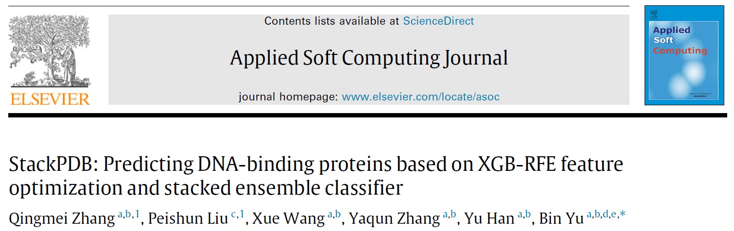 人工智能与生物医学大数据研究团队于彬副教授,在计算机科学一区TOP期刊Applied Soft Computing (IF=5.472) 上发表标题为“StackPDB: Predicting DNA-binding proteins based on XGB-RFE feature optimization and stacked ensemble classifier”的高水平论文,报道了构建预测DNA结合蛋白的人工智能算法模型—StackPDB。该模型表现出较强的泛化能力以及优异的计算稳定性。于彬副教授为论文的通讯作者,研究生张青梅为第一作者,青岛科技大学为第一完成单位。