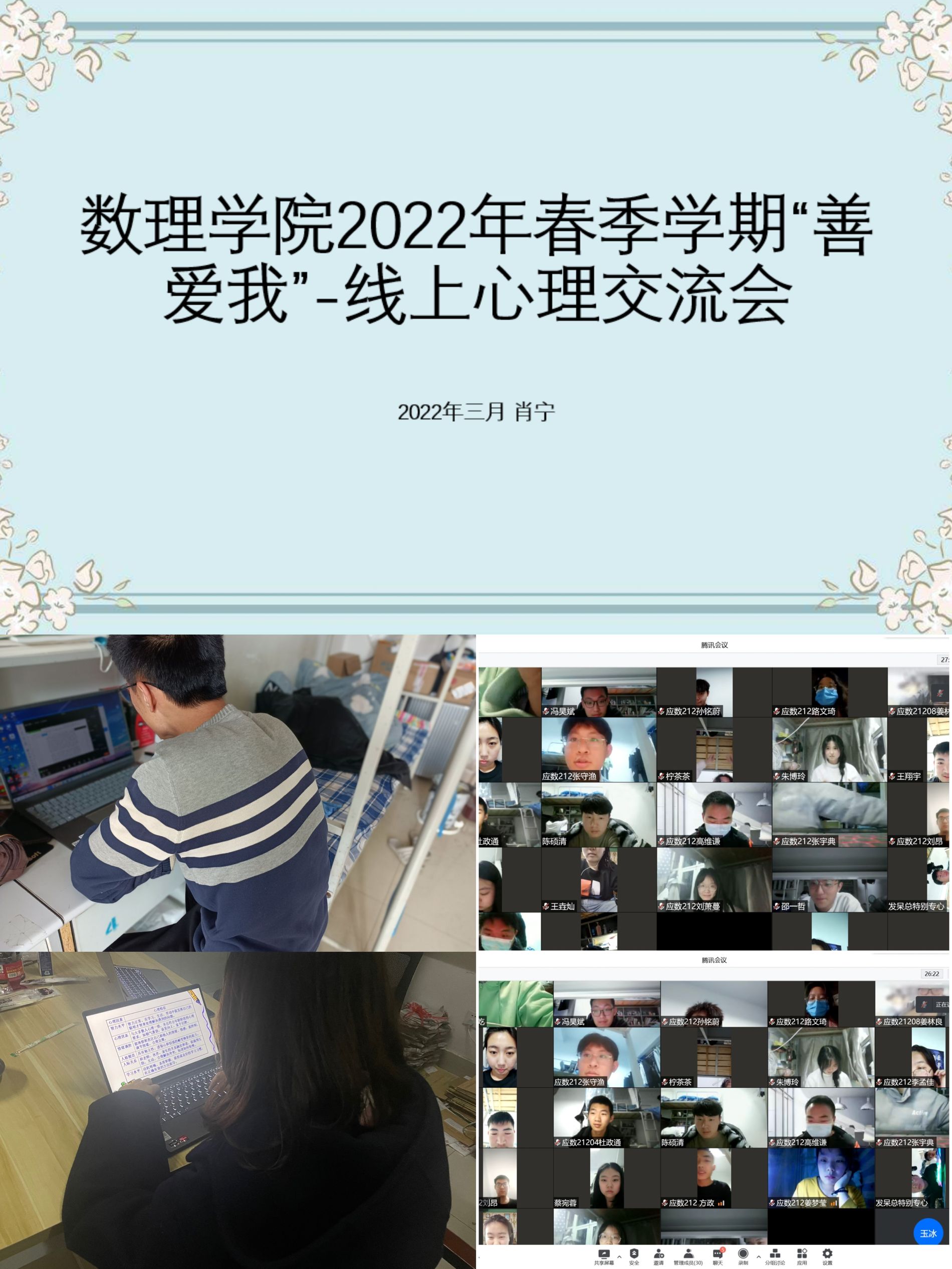3月25日,学院举办了“善爱我-线上心理交流会”活动,会议采用腾讯会议的线上会议模式。首先,肖宁向同学们讲解了心理健康的相关知识,建议同学们疫情防控下通过制定一个计划、钻研一件事请、找到一种支持、进行一项锻炼、思考一些体验等方式,缓解心理压力;自己无法调整时,应当寻求在线心理咨询。良好的心理状态有助于提高自身免疫力。