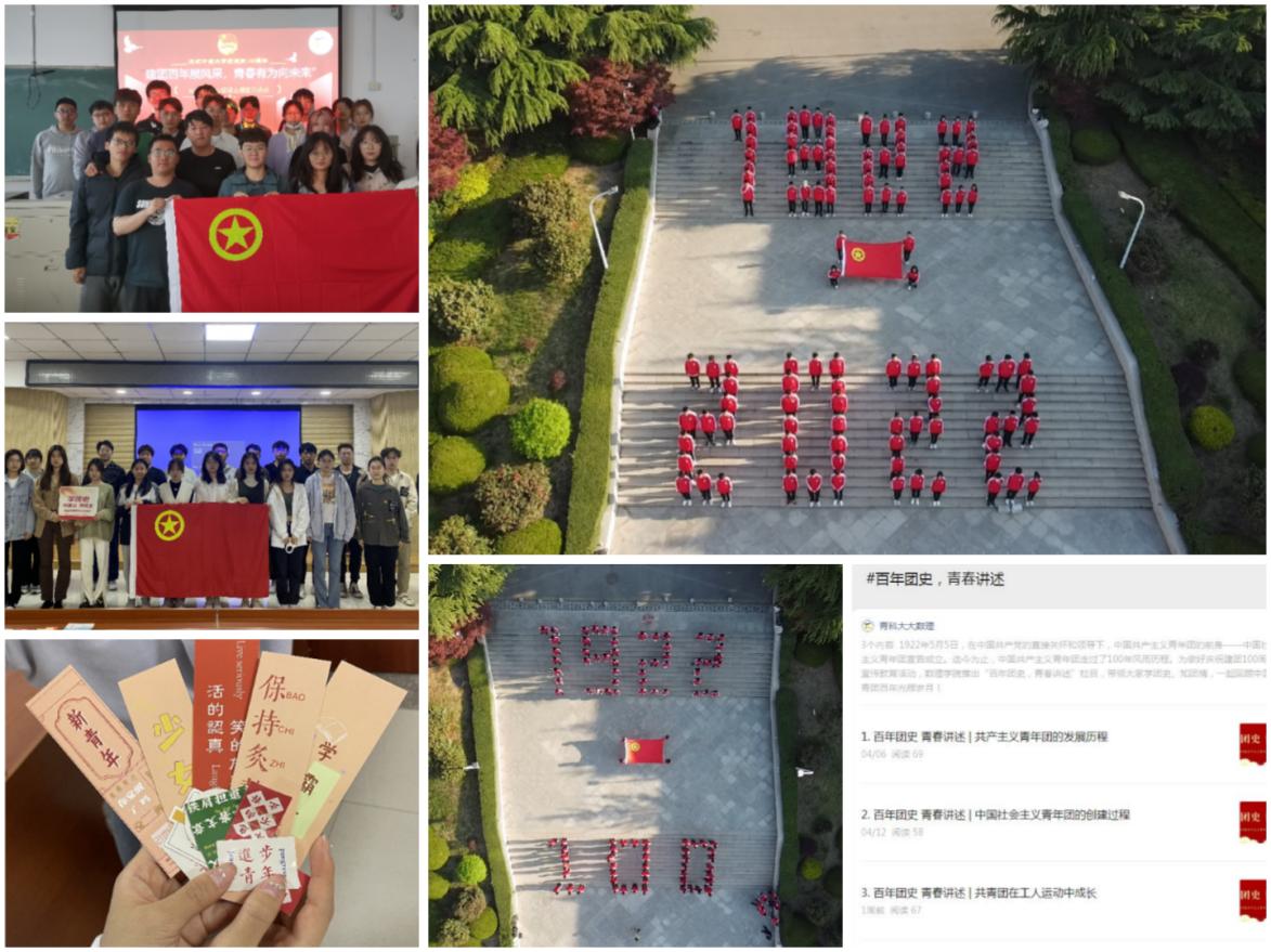 团委组织各级团学组织以“五四精神传薪火,奋斗青春展芳华”为主题,开展庄重热烈、主题鲜明、形式多样、广泛参与的系列教育活动,通过团史红色宣讲、重温入团誓词、“奋斗心声”分享会、“‘数’说团史”盲盒知识竞答等形式,唱响“高举团旗跟党走,青春之歌百年红”的主旋律,讲好“青春版”奋斗故事。组建青年马克思主义宣讲团开展青马工程系列宣讲活动,精心设计理论学习、共青团主题教育、红色故事、科创心得、读书分享等六大专题内容,力争提高学院团员青年学生的思想政治理论素养、创新能力和实践水平。