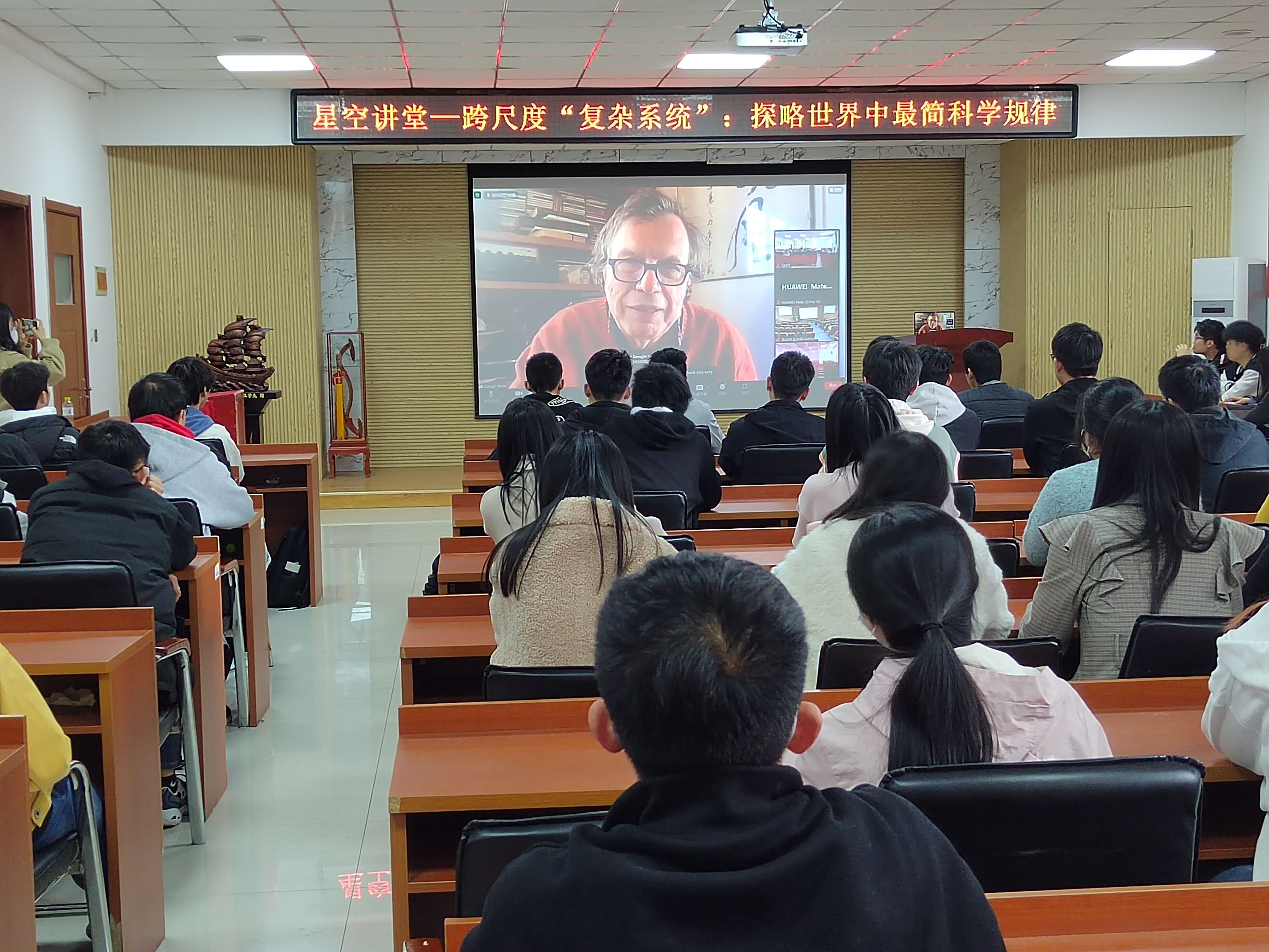 本次讲座的主题为跨尺度“复杂系统”:探略世界中最简科学规律。乔治·帕里西教授用通俗风趣的语言揭示现实世界里蕴含的规律,结合自旋玻璃理论、表面生长、多重分形、随机共振和鸟群等相关领域谈及复杂系统的研究。同时,教授也分享了个人的学习、研究经历,以及取得研究成果的历程与心得。教授深入浅出的讲解和实时双语字幕的支持,让现场师生无障碍领略了顶尖科学家的风采,启发大家发挥主观能动性,探寻复杂系统下的最简科学规律。