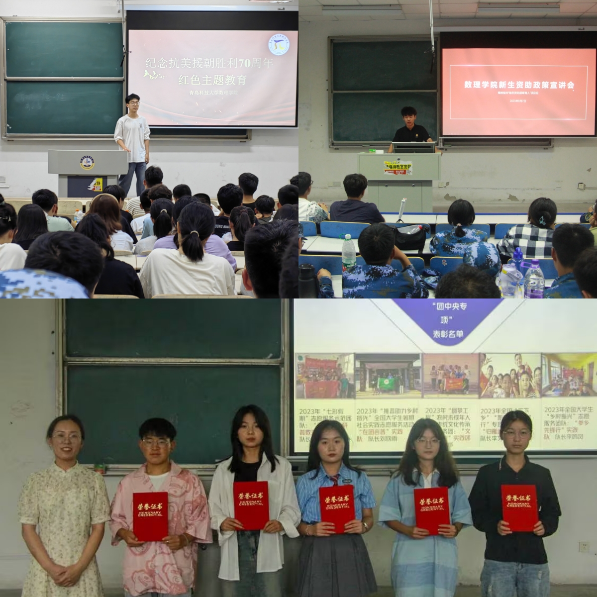 面向大一、大二全体学生召开暑期社会实践总结表彰会,共同回顾暑期社会实践的精彩瞬间。在实践过程中,数理学子深入基层,走进甘肃、新疆、云南、河北、山东等地,涌现出一批优秀的青年志愿者,授予崔振华、张梦、王柯元等62位同学“实践π”荣誉称号。实践团队负责人代表崔振华作为“社会实践优秀个人”做典型发言,分享了实践感悟与成就,展现了青年学生在实践中学思践悟的家国情怀,体现了数理青年学生在服务社会发展中的挺膺担当,帮助新生树立躬身实践意识、强化志愿服务精神。“隐形资助育人”朋辈团队进行了资助宣讲,介绍了育人团队在23级迎新朋辈家访中发挥的重要作用,以实际行动帮助新生熟悉资助政策,并在“受助者助人”的良性循环中获取力量、传递力量。