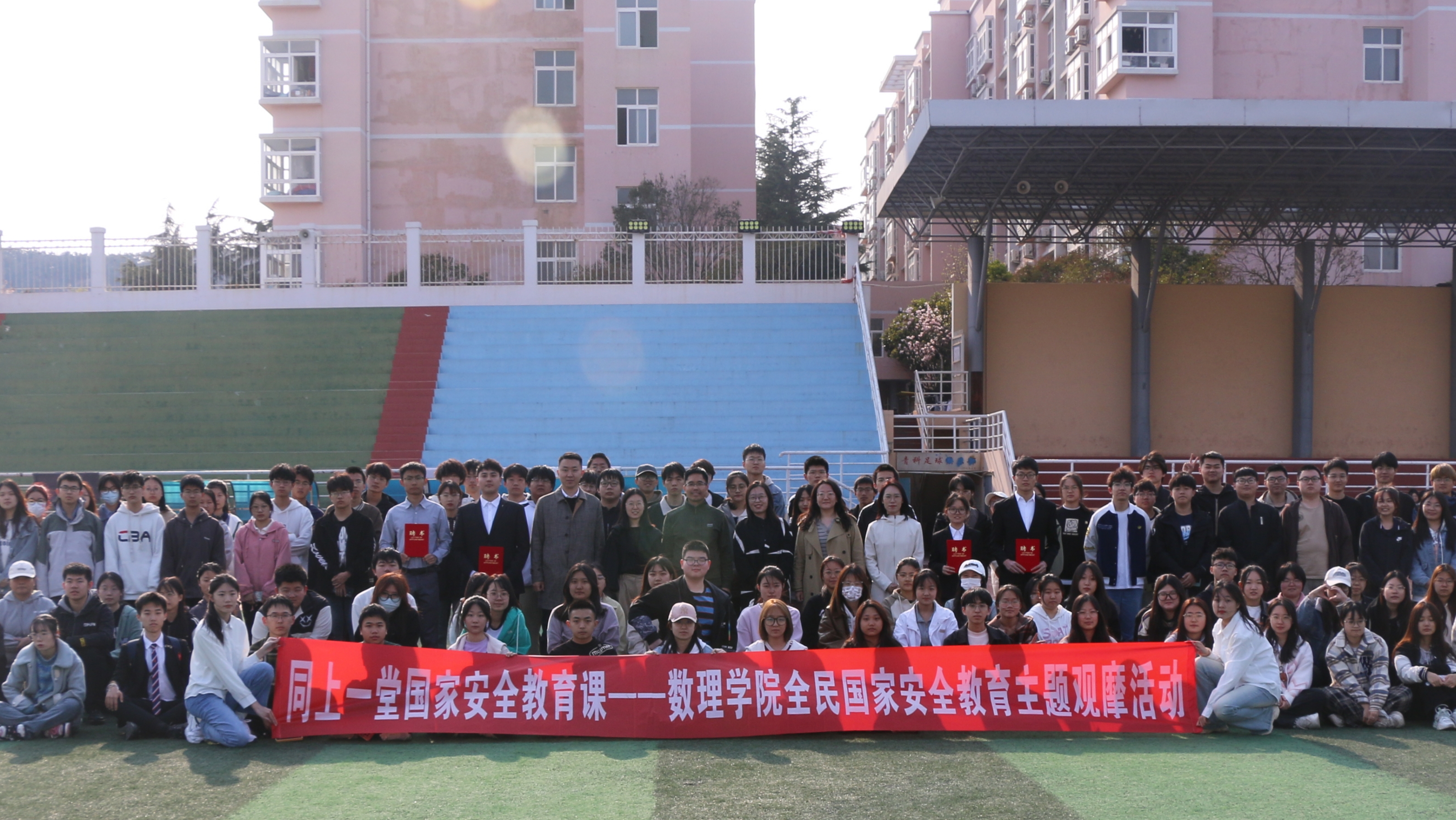 在运动场上开展“同上一堂国家安全教育课”--国家安全教育主题观摩活动。学校党委学生工作部副部长兼武装部副部长李春家,金财娱乐城