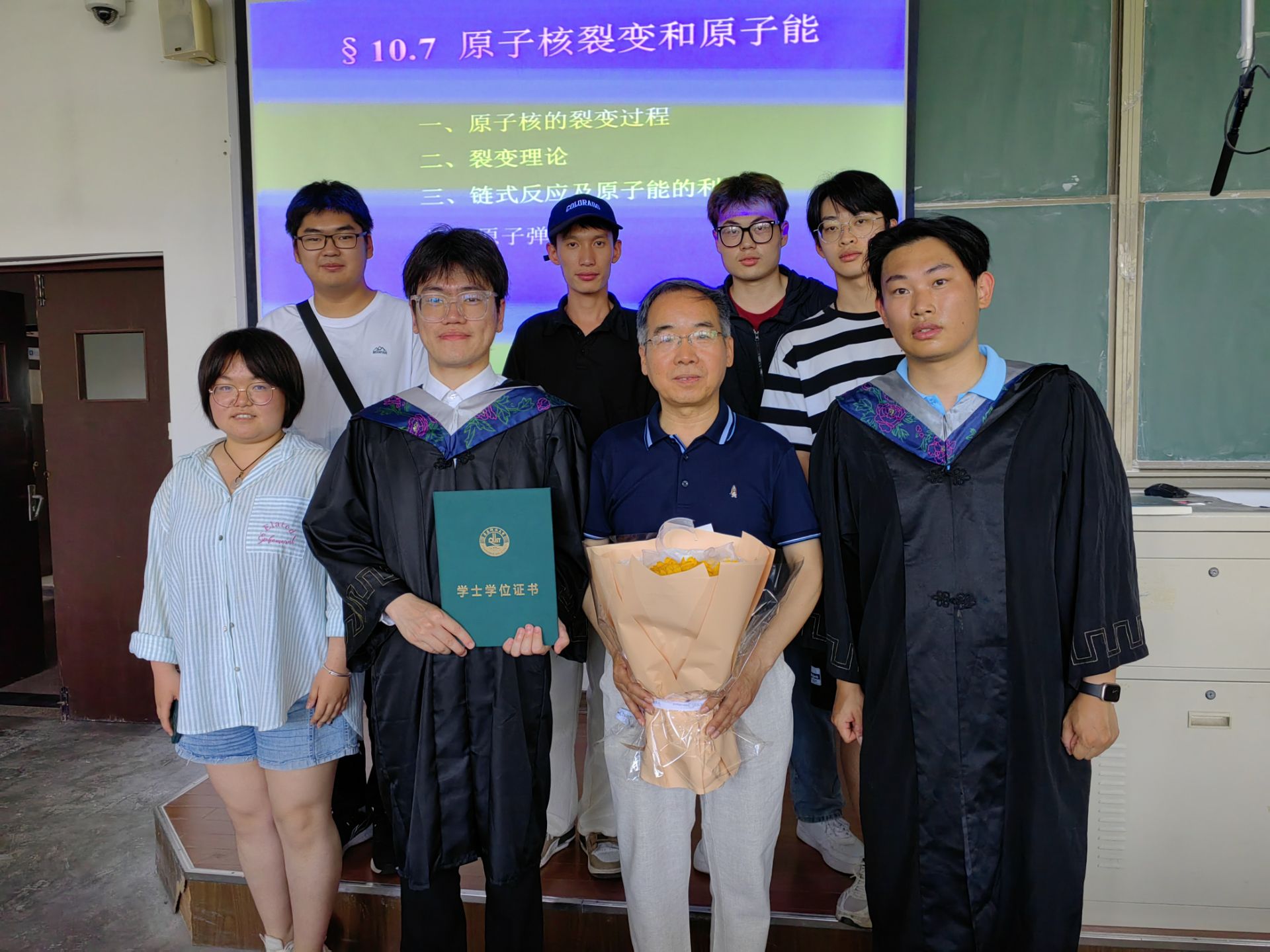 热闹毕业典礼刚刚结束,几名即将离校的毕业生就悄悄从后门走进了籍远明老师《原子物理学》的课堂上。