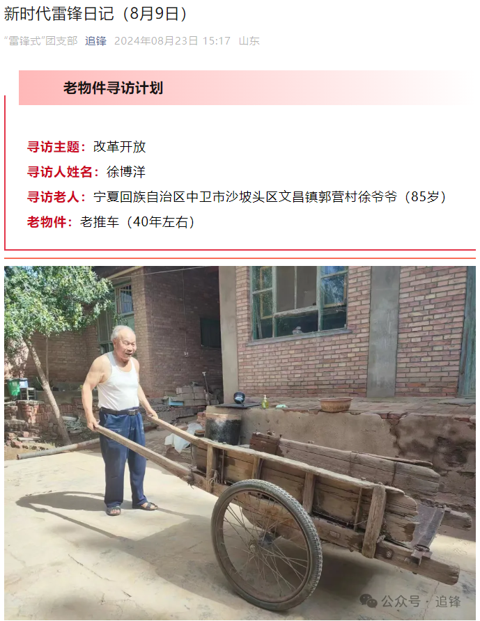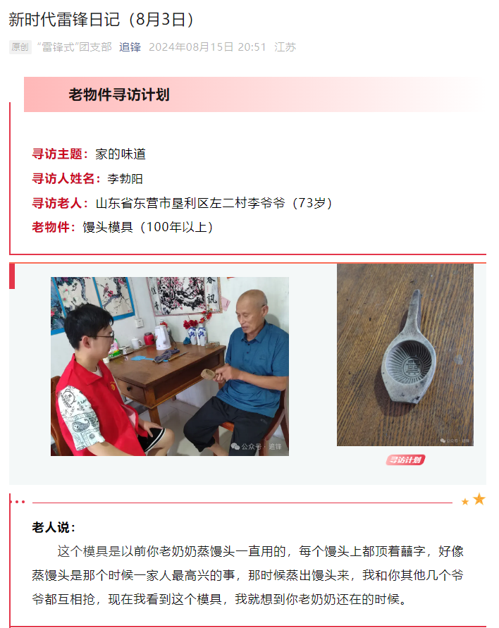 “雷锋式”团支部开展“老物件寻访行动”,旨在通过寻访老人家中的老物件,从而走近老人、了解老人、陪伴老人,挖掘那些被岁月尘封的记忆,并借用新媒体方式将老人的记忆保存下来、传递出去,让其中闪烁着的“勤劳”“奋斗”“奉献”等人生光芒再次照亮新时代青年的人生旅程。