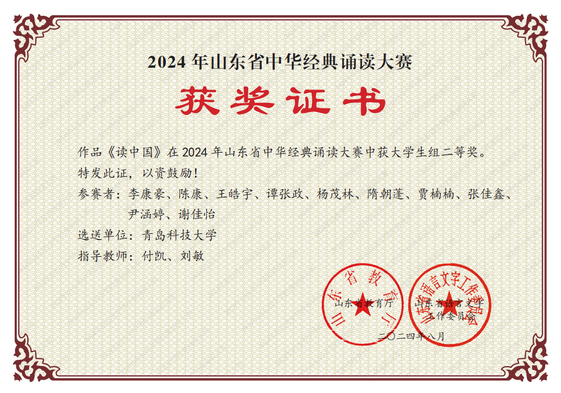 据悉,2024年山东省中华经典诵读大赛由山东省教育厅、山东省语言文字工作委员会主办,山东教育电视台承办。大赛主题为“典耀中华,赓续文脉”,以诠释中华优秀文化内涵、彰显中华语言文化魅力、弘扬中国精神为目标,旨在提升社会大众特别是广大青少年的语言文字应用能力和语言文化素养,激发对中华经典的热爱,助力推进文化自信自强,为实现中华民族伟大复兴凝聚磅礴力量。本次作品由学院团委指导,不断悉心打磨,经校赛选拔报送,最终在省赛中脱颖而出,荣获二等奖。