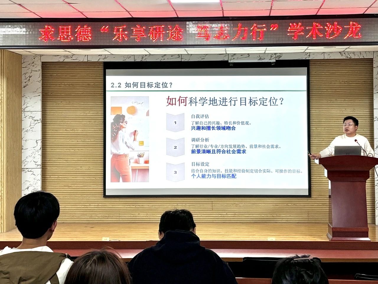 赵炜学姐以“流水不争先,争滔滔不绝”为题,介绍了许多实用的科研申博经验和时间管理技巧,例如设定清晰的阶段性目标以明确科研方向,合理规划时间以提高工作效率,以及在遇到挫折时及时调整心态、坚持不懈。