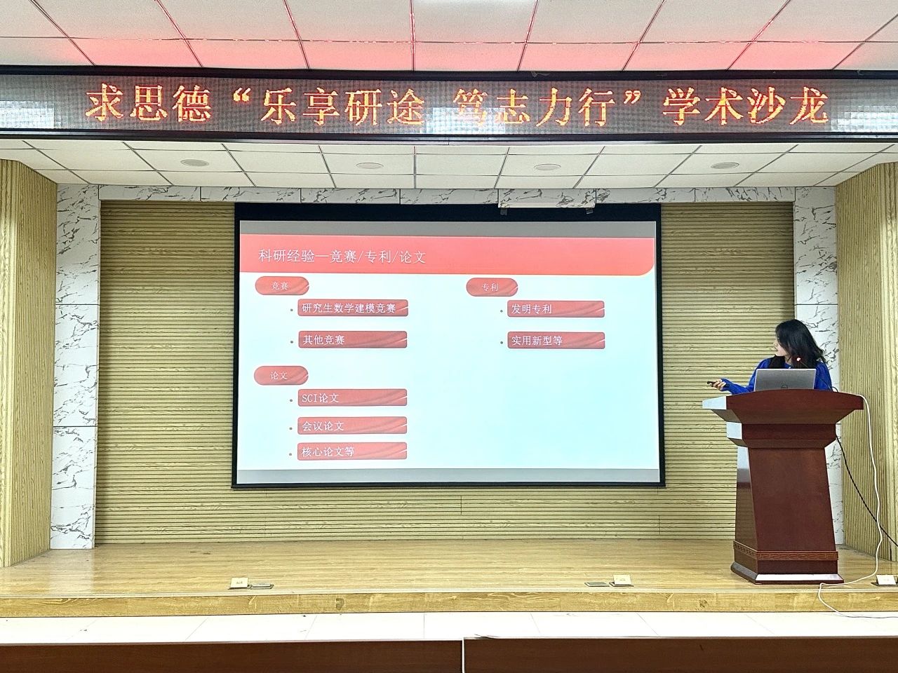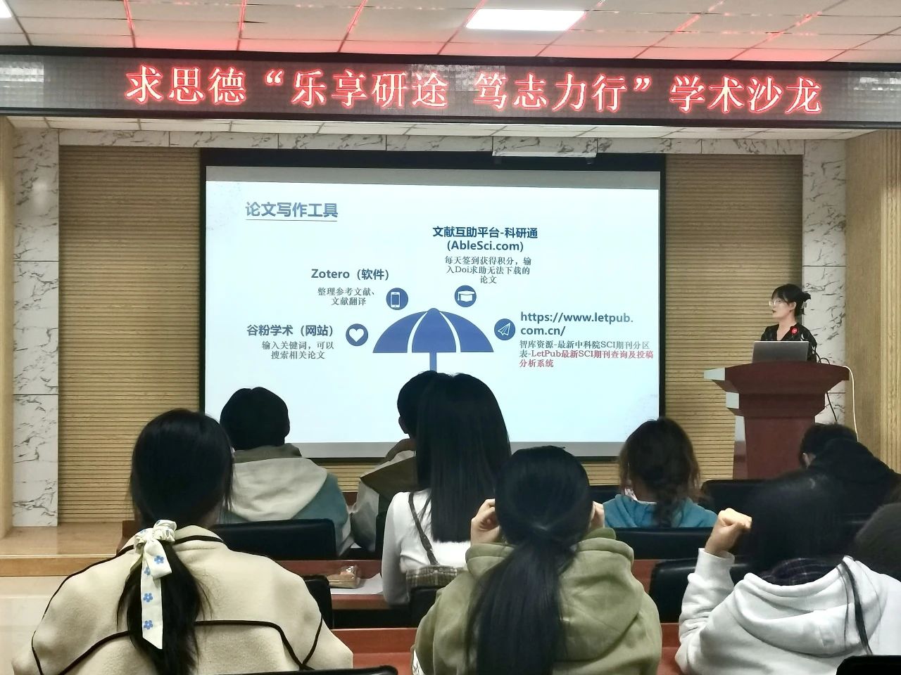 王冬梅学姐则以“山有峰顶,海有彼岸”为题,向同学们系统介绍了论文撰稿投稿的方法、流程与自己的科研经验。希望通过这些经验的分享,帮助大家在繁忙的科研生活中既能高效产出成果,又能维持良好的生活节奏与心理健康。