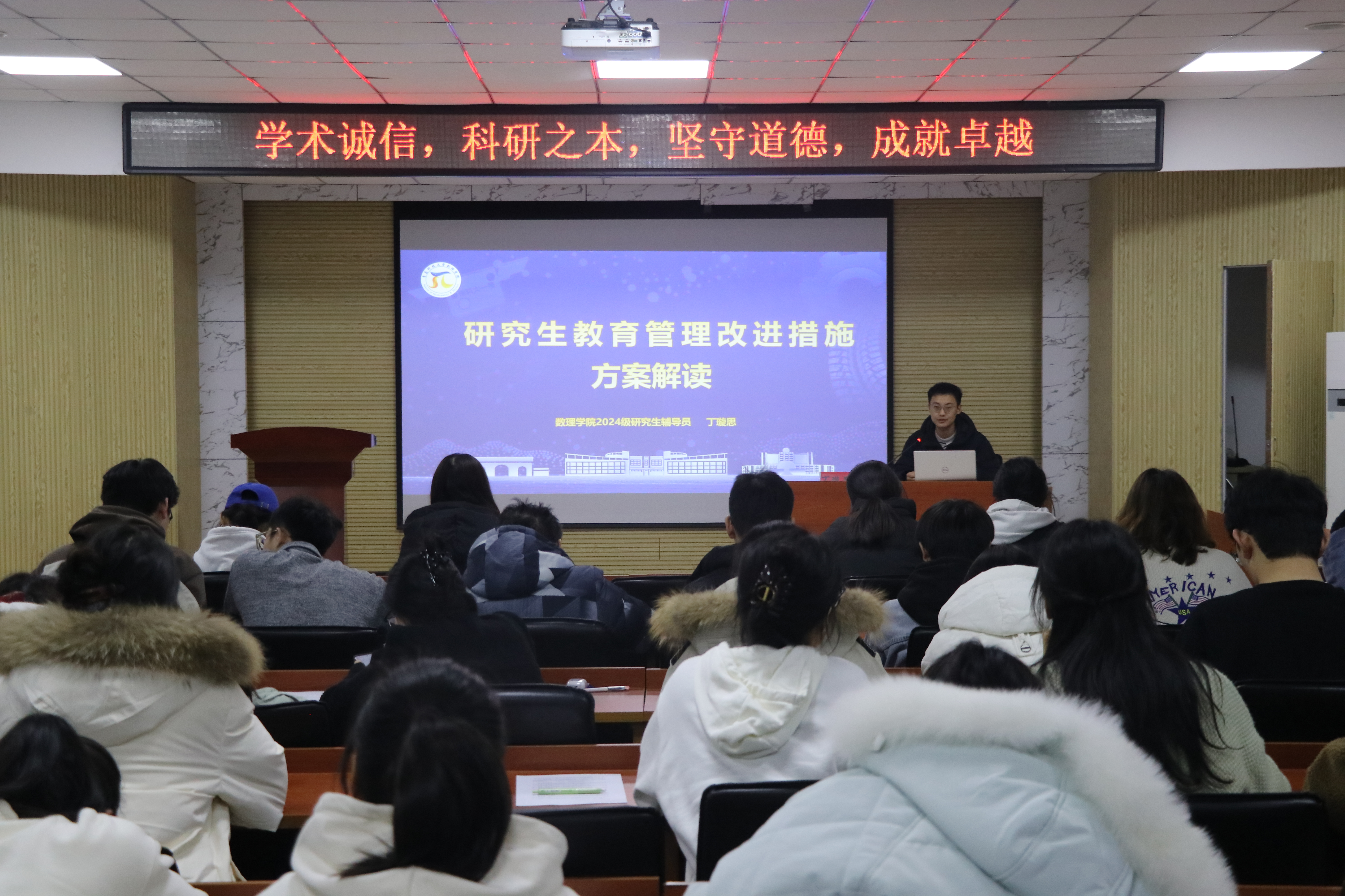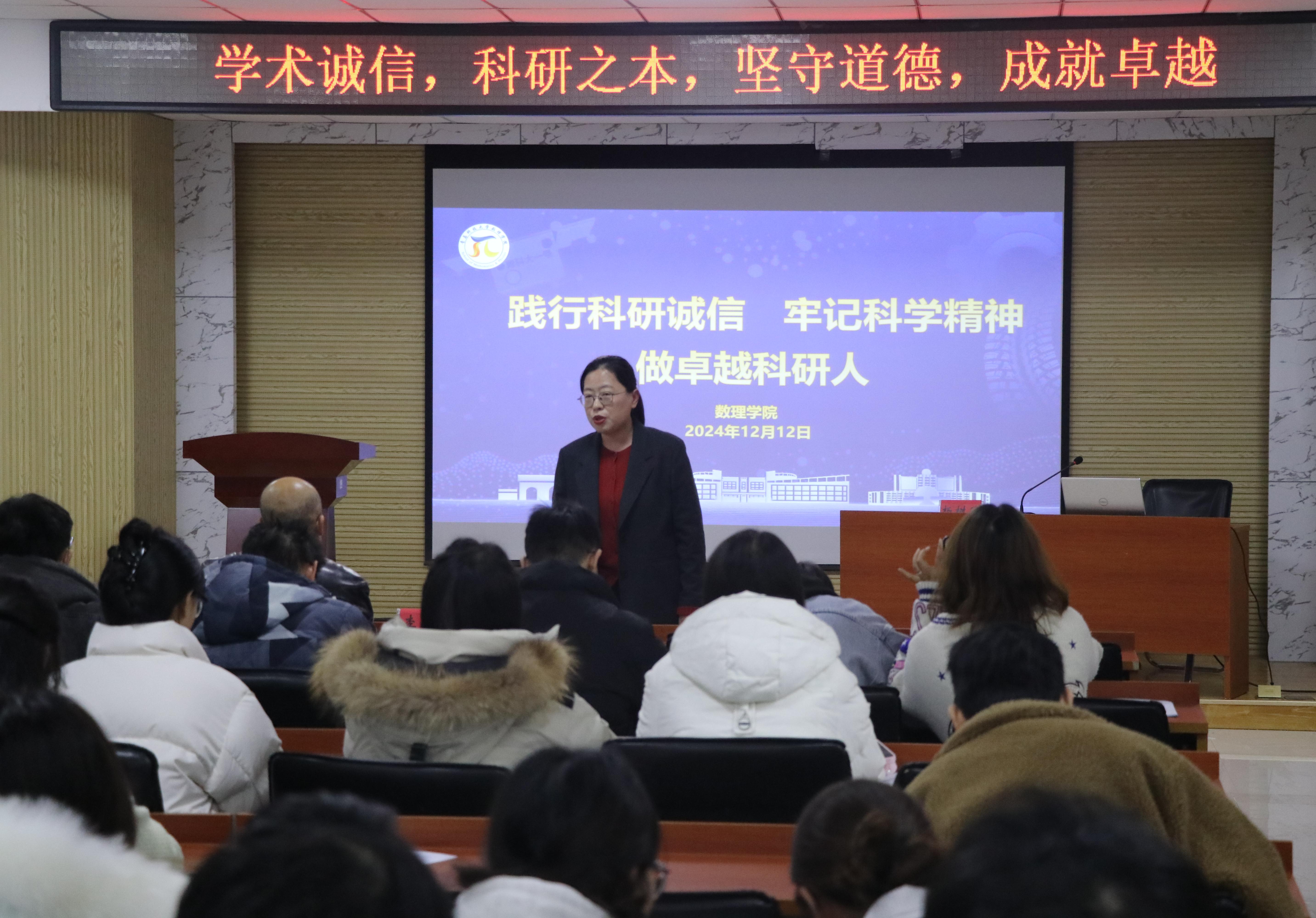 院长杨树国为2023级、2024级研究生做“践行科研诚信,牢记科学精神,做卓越科研人”的专题讲座,学院党委副书记李雯雯主持活动。