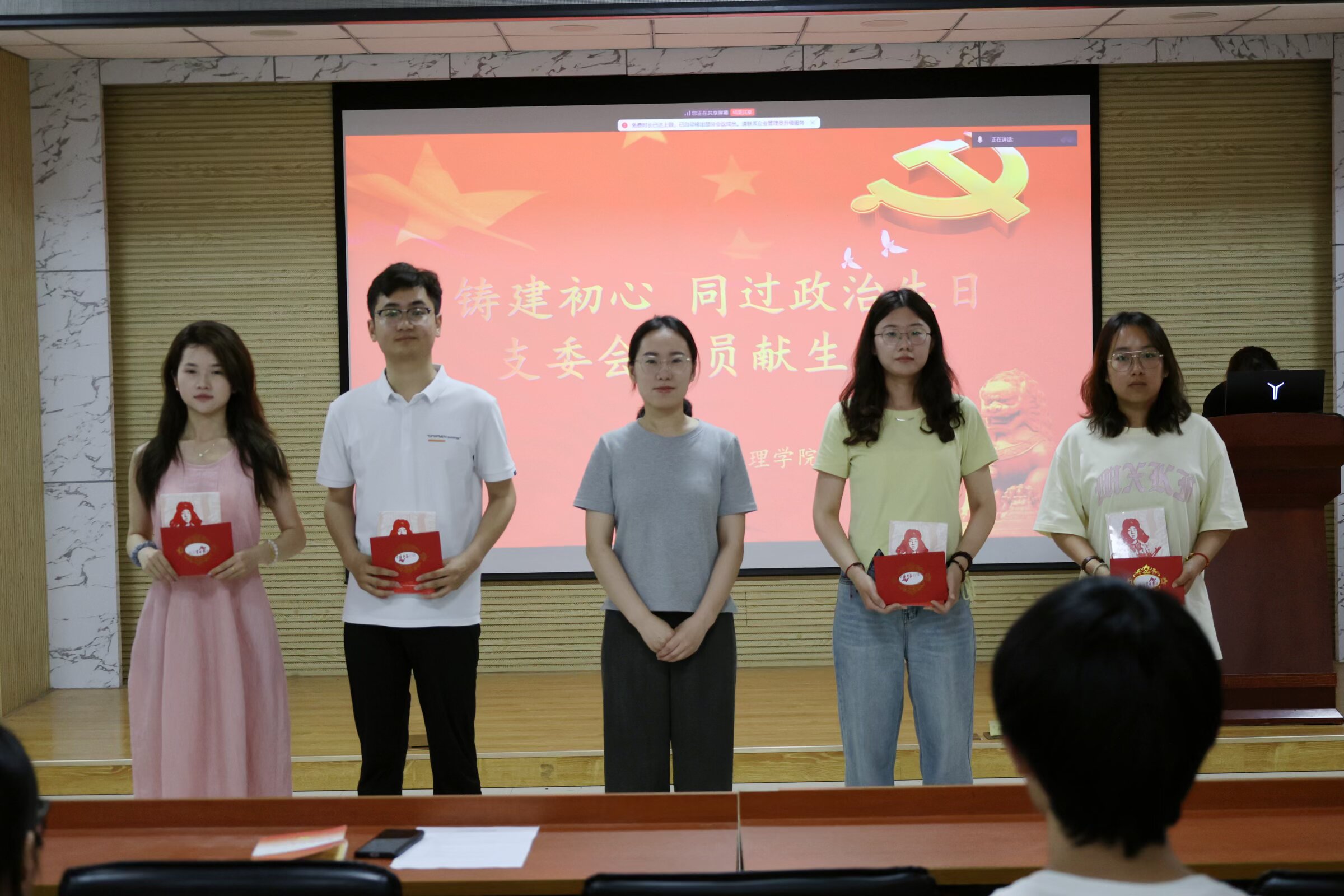 在“政治生日”环节,慕昕茹、吴娜、张子萱和肖博四位6月份入党的同志带领全体党员重温入党誓词。他们依次回顾了在党组织的培养下取得的进步,深刻剖析了自身存在的不足,并提出了改进措施和努力方向。支部书记刘敏为四位同志献上政治生日贺卡和学习资料。