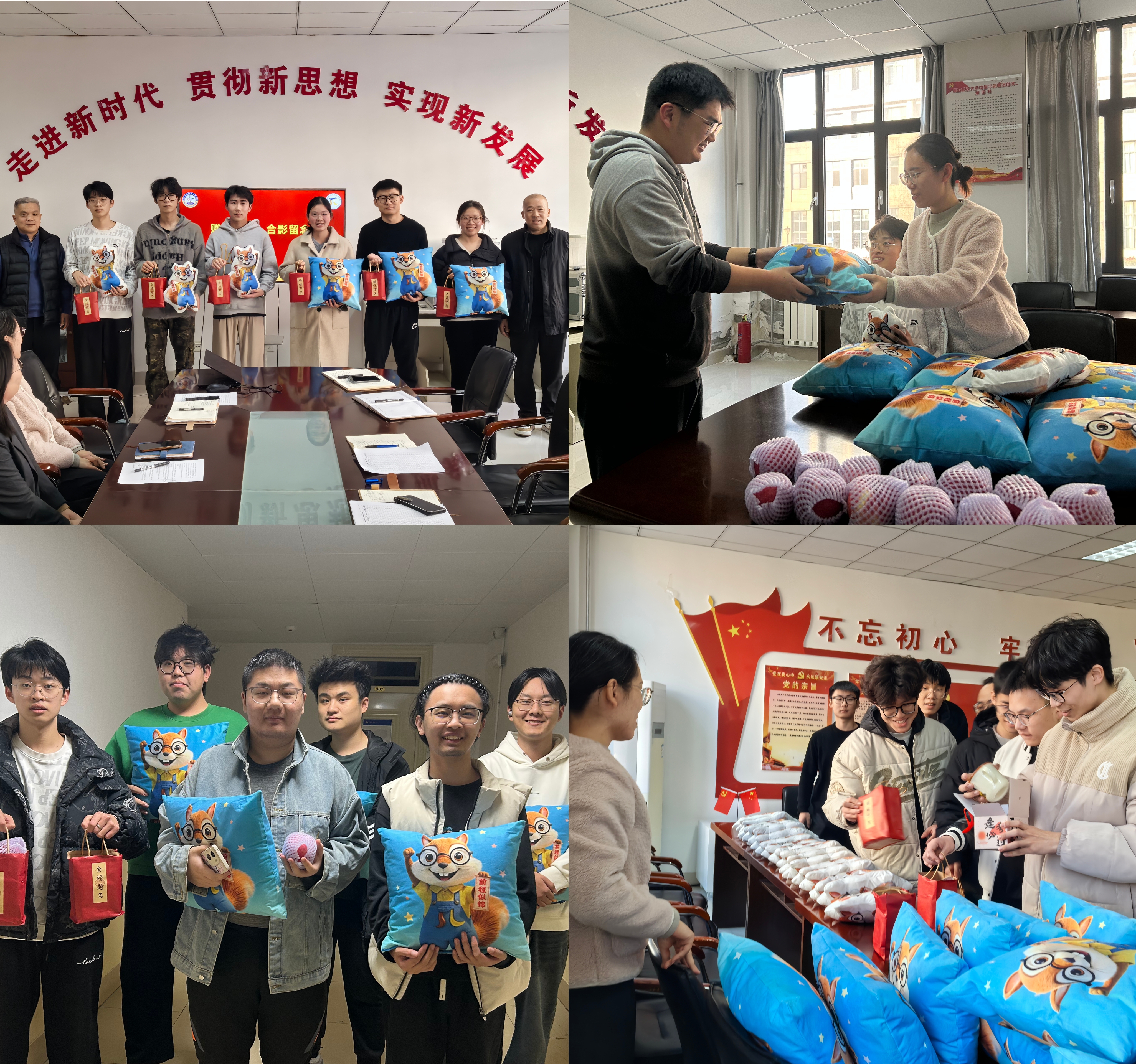近期,学院还为考研学子准备了包括学院吉祥物小π形象抱枕、玩偶、定制马克杯及寓意“平安顺遂”的苹果在内的“温暖心意”,学院党委书记刘保成、杨树国等现场为各班学生代表赠送了礼物,一份份暖心礼物让同学们切实感受到了学院的关怀与温暖。