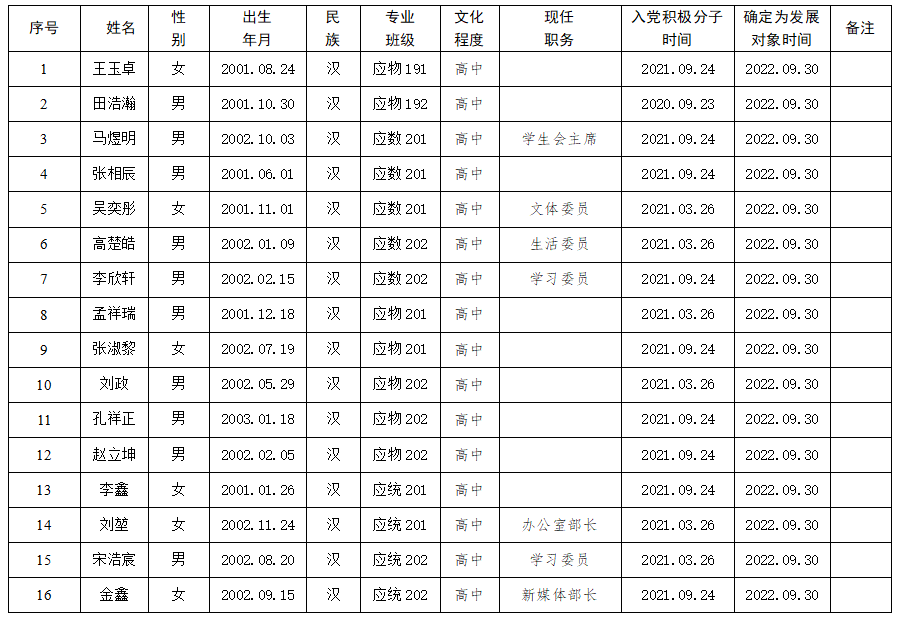 经金财娱乐城 学生党支部研究讨论,金财娱乐城 党委审核,拟确定王玉卓等16名同志为党员发展对象,现公示如下,如发现公示对象有不符合党员条件方面的问题,可在公示期内实名反映。