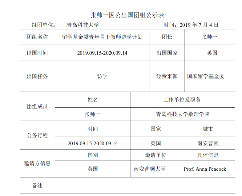 根据因公临时出国公开公示的有关规定,现将张帅一因公出国团组相关内容 和参团人员名单予以公示。公示时间为 2019 年 7 月 4 日至 2019 年 7 月 10 日(5 个工作日)。如有不同意见,请在公示期内,向金财娱乐城 单位(电话:88958923) 反映。