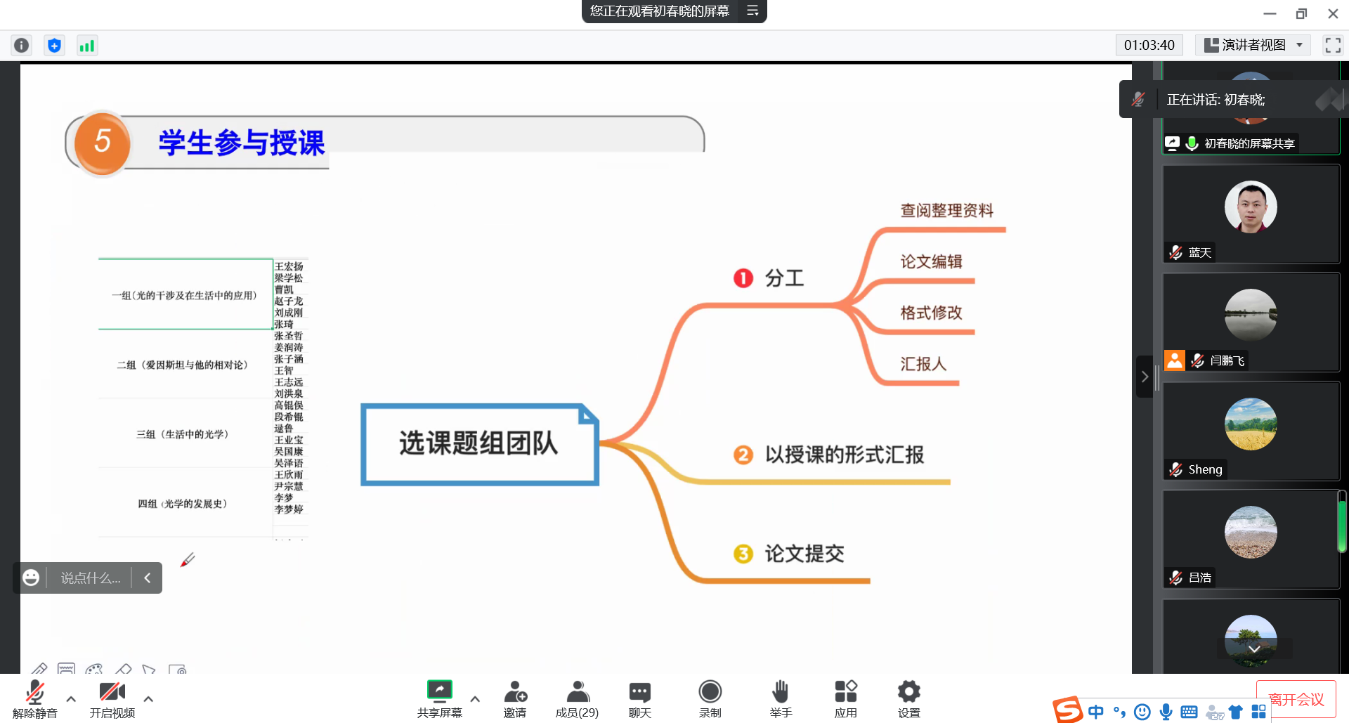 闫鹏飞以《力学》为例,介绍了应用物理学专业课开展课堂教学改革的举措和效果,向老师们分享了BOPPPS教学模式在课堂教学改革中的实践。吕浩、夏丰金、初春晓三位老师分别从课堂教学改革的模式及措施探索、课程思政在物理课程中的融入、课堂教学改革中如何充分调动学生的参与度等方面做了交流,分享了我校物理教学的学情分析、翻转课堂的实施、物理思维的培养、学习通平台的使用、过程性考核的实施、课程论文的考核等。围绕课堂教学改革,与会教师展开了热烈的讨论,大家一致表示,课堂教学改革是适应新形势、融入新格局的重要方式,是促进物理教学成果提升的有效途径,要群策群力、集思广益,把改革做好。