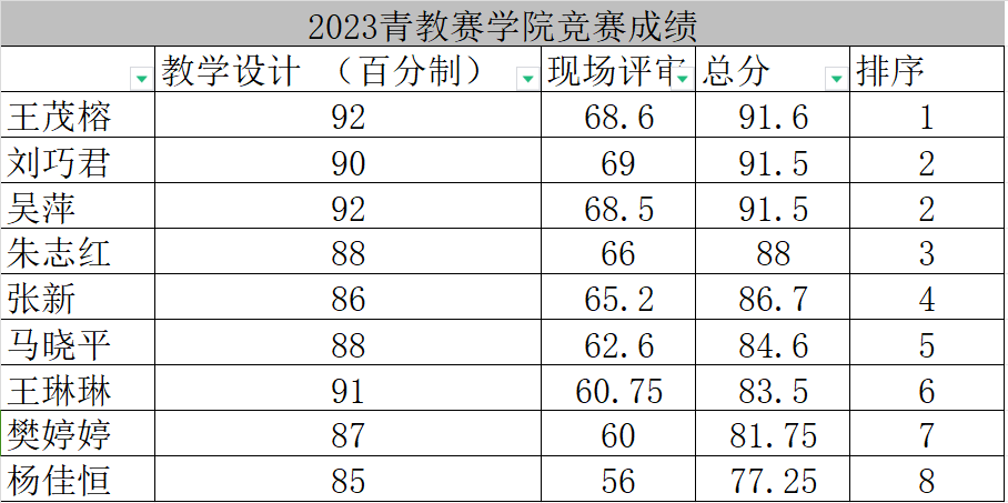 进行了青年教师教学竞赛,经教学设计比赛及现场评审(参与现场比赛的为教学设计评分85分以上的教师),现将比赛成绩公示如下: