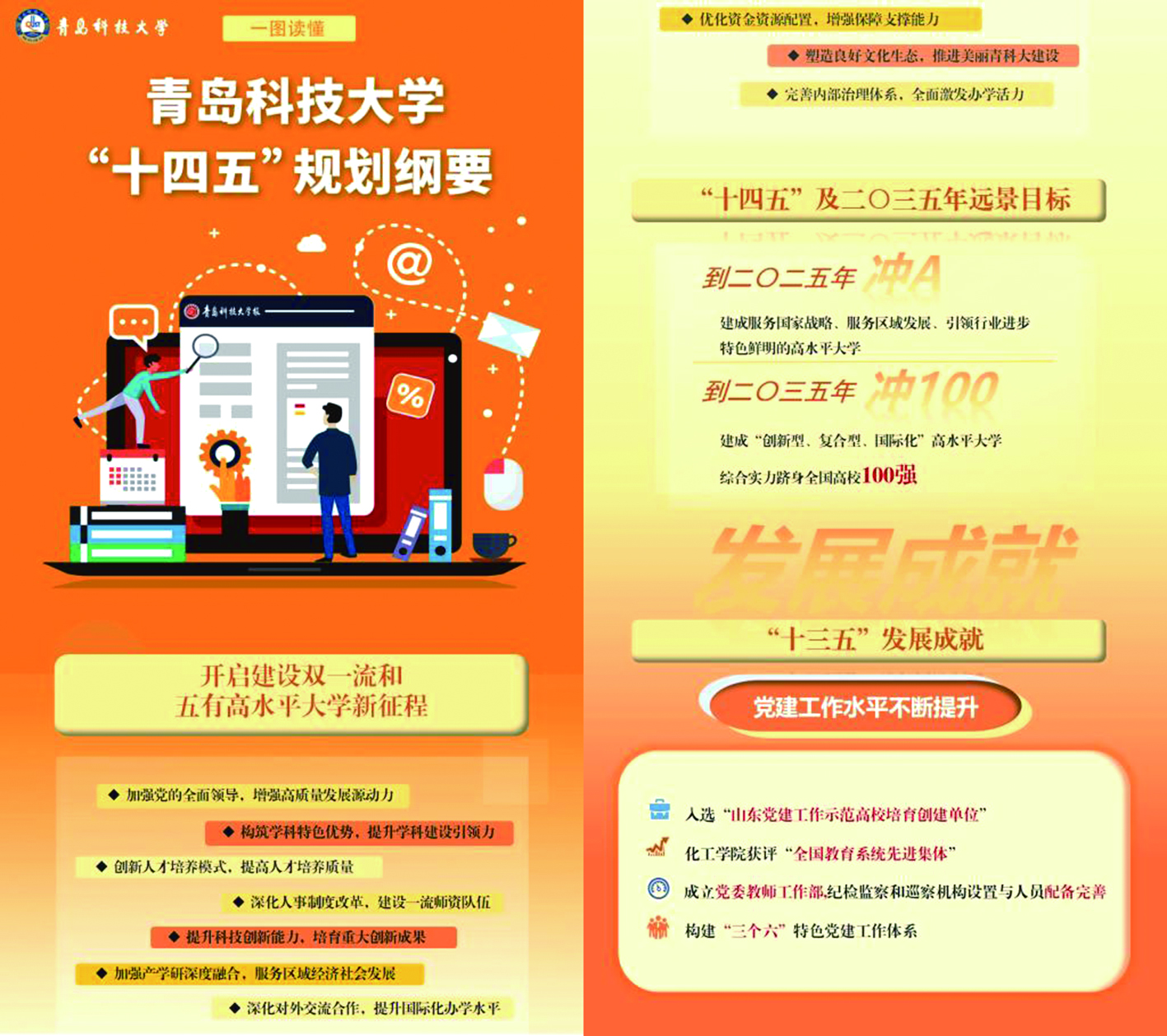 立足“十四五”开新局,学校制定了《“十四 五”发展规划和二〇三五年远景目标纲要》,明确了建成“服务国家战略、服务区域发展,引领行业进步特色鲜明的高水平大学”的发展目标,并从发展基础与发展环境,指导思想、遵循原则与主要目标,主要任务与思路举措,组织实施四个方面进行了阐释。明确了加强党的全面领导、增强高质量发展源动力,构筑学科特色优势、提升学科建设引领力,创新人才培养模式、提高人才培养质量,深化人事制度改革、建设一流师资队伍,提升科技创新能力、培育重大创新成果,加强产学研深度融合、服务区域发展,深化对外交流合作、提升国际化办学水平,优化资金资源配置、增强保障支撑能力,塑造良好文化生态、推进美丽青科大建设,完善内部治理体系、全面激发办学活力等十个方面的任务和措施。为学校未来五年乃至更长时期的战略规划、事业发展的总体目标、主要任务和重大举措提供基本遵循,进行顶层设计,成为全校师生员工共同奋斗的目标引领。
