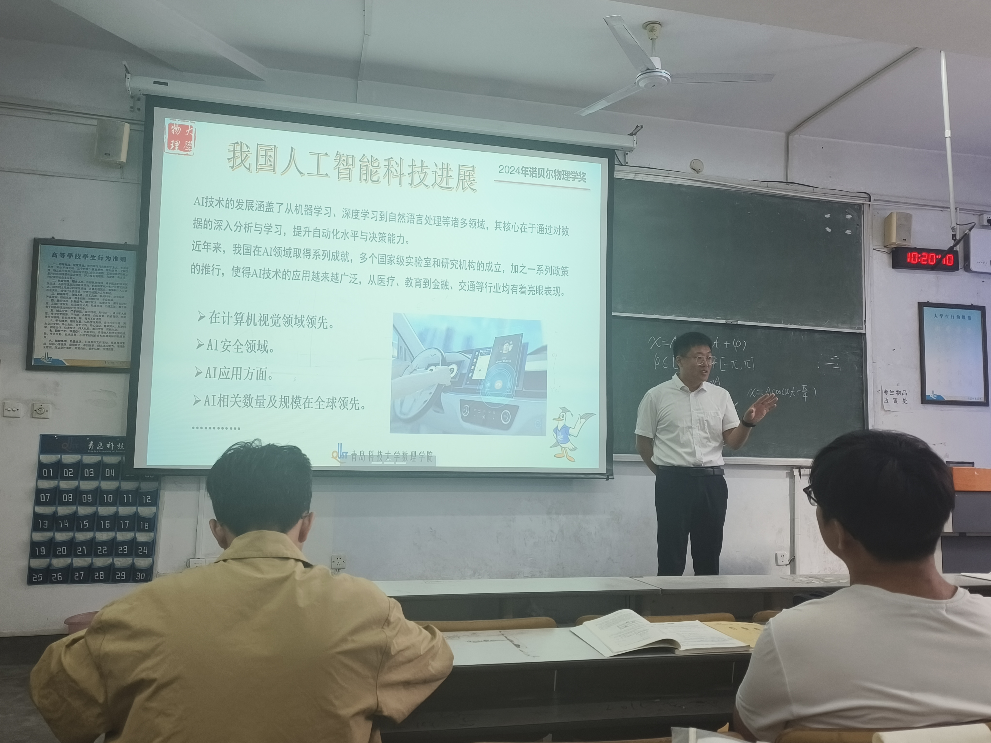 讲授过程中老师们通过多媒体展示,结合实际案例,介绍了当前我国在人工智能领域的最新进展和实际应用,如医学诊断、无人驾驶等,让学生直观感受到人工智能技术的发展对现代社会的影响。最后,老师们引导学生思考物理学在人工智能领域的应用,如何通过物理学的方法和理论来优化和改进机器学习算法,并鼓励同学们要扎实学好数理基础知识,拥抱人工智能,为科技自立自强贡献青春力量。