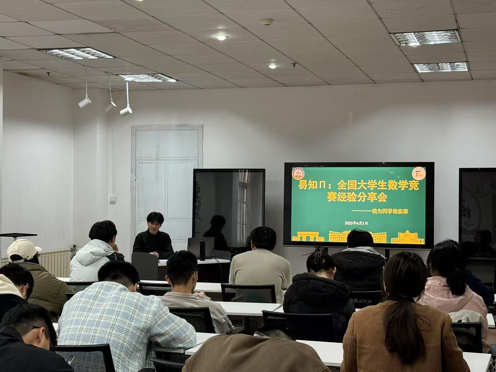 分享会上,3名主讲人结合自身备赛经历展开多维分享。应数232班孟祥飞系统解析竞赛知识体系,讲解“基础定理推导”和“典型例题精练”相结合的双轨学习法;应数231班王子瑶结合自身经验,展示如何利用各种数学习题集教材与网络资源提升自身核心素养;应物221班张景鹤着重分享跨学科备赛经验,展示如何将数学思维迁移至物理问题求解。活动特别设置“1v1诊断”环节,主讲团队针对典型习题进行分步拆解,逐一解答现场疑问。2024级学生赵天宇表示:“学长们对数学竞赛的深入讲解让我豁然开朗,特别是对微分方程模块的解题框架有了全新认知,听完之后我备赛的信心更足了,希望接下来能代表学院拿到好成绩。”“易知π”负责人刘浩晨介绍,后续将推出“线上答疑专区”“一对一竞赛指导”等系列服务,以朋辈影响助力提升“数学竞赛种子库”选手的竞赛水平。