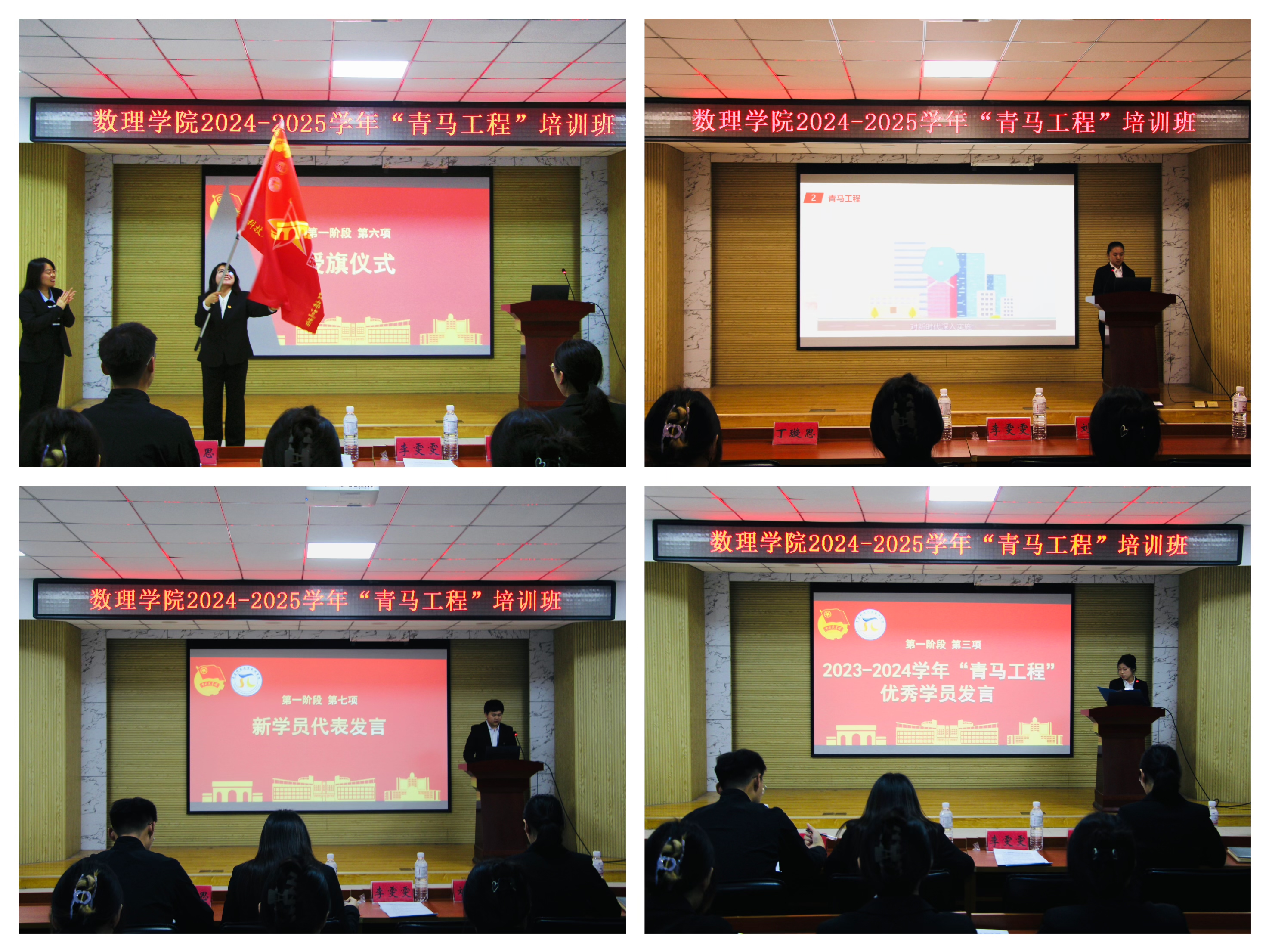 付凯为本期培训班学员代表授旗。刘敏宣读2024-2025学年“青马工程”实施方案。丁璇思宣读学员名单。往届学员代表都雪、新学员代表于文昊依次发言。