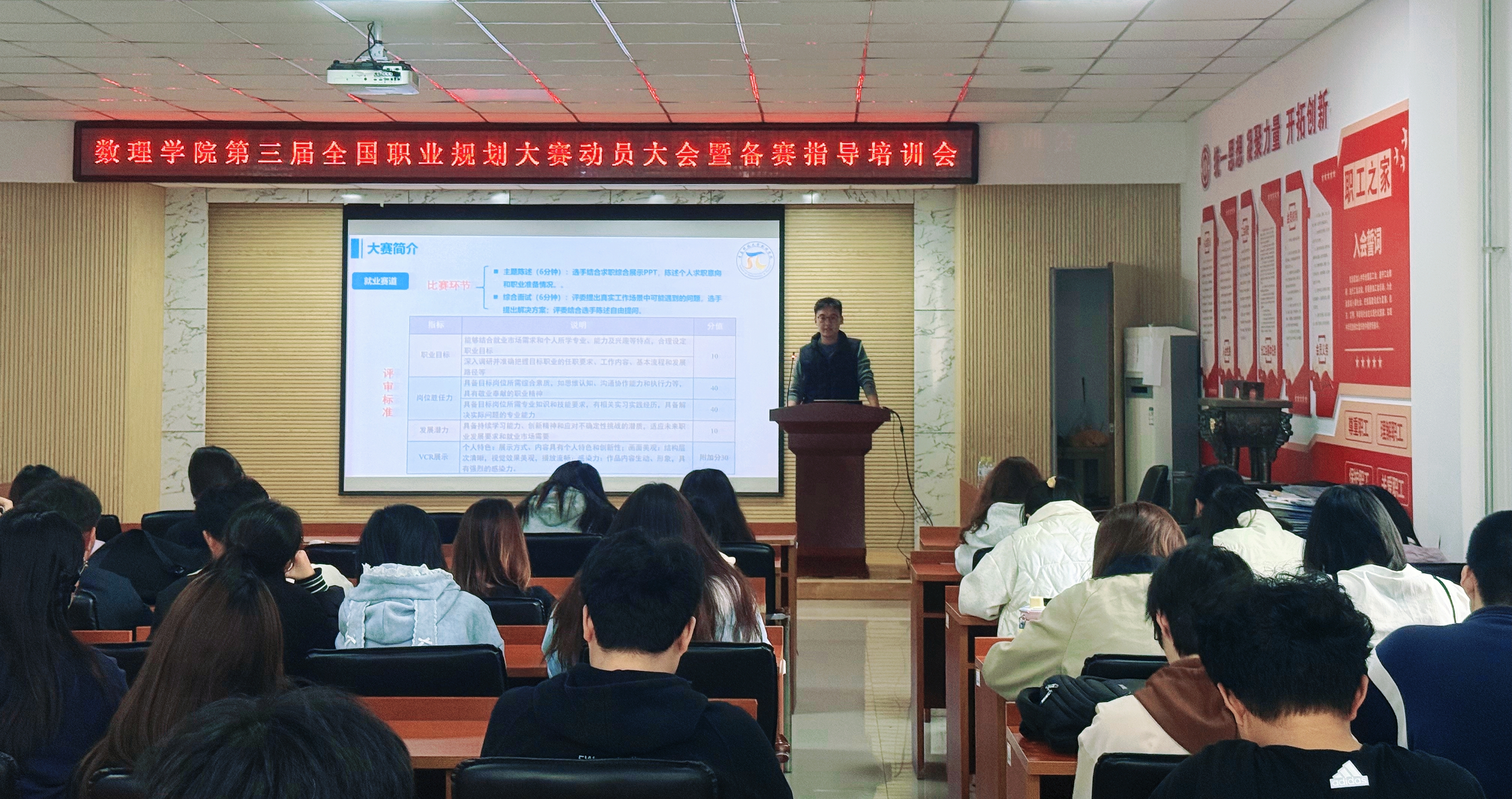 学院高度重视本次职业规划大赛,将其作为深化人才培养,推动就业育人工作的重要载体与关键抓手。会上,丁璇思围绕职业规划大赛的主题与重要意义展开详细解读,他指出,职业规划大赛是学生明确职业方向、提升综合素养的重要平台,不仅能帮助同学们精准定位职业目标,更能通过备赛过程锤炼实践能力、增强就业核心竞争力。此外,会议还系统介绍了大赛的赛事组别、赛程安排、作品要求等关键内容,并结合往届案例,指导学生将个人规划与自身专业、国家需求相结合,助力学生在比赛中明晰社会价值坐标,为未来职业发展奠定清晰基础。